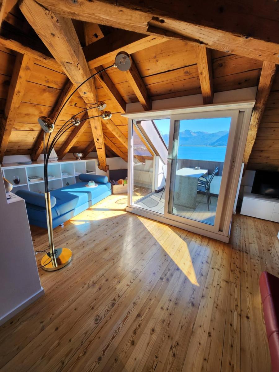 Balcony views capture the quiet movement of boats along the promenade. Breakfast area images present a bright setting overlooking the lake. The overall visual narrative centers on openness, light, and proximity to the shoreline.